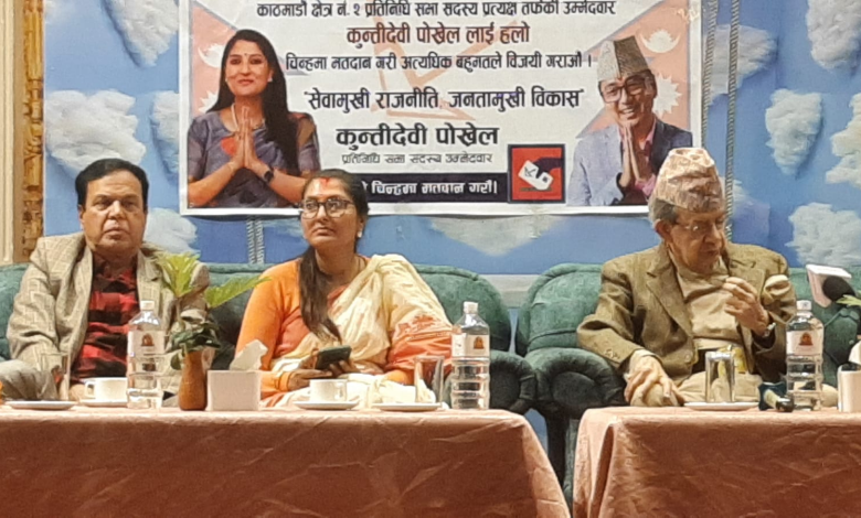 उम्मेदवार कुन्ती पाेखरेलले विगतका पराजयबाट विवध शिक्षा ग्रहण गरी काठमाडाैं क्षेत्र नं. २ का बासिन्दाका घरघरमा, गाउँशहरमा भाैतिकरूपमा उपस्थित हुँदा संघीय राजधानी काठमाडाैंकाे छत्रछायामा रहेका ग्रामीण बस्तीहरू अति विकट र दुर्गम जस्ताे लाग्ने गरी विविध समस्याले झेलिएकाे पाउँदा आफूले मा थाम्न नसकेकाे भाव व्यक्त गर्दै याे पटक संसदमा पुगेर हरेक समस्या निराकरण गर्न तैयार रहेकाे प्रतिबद्धता व्यक्त गरेकी छन् ।