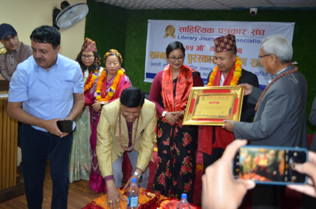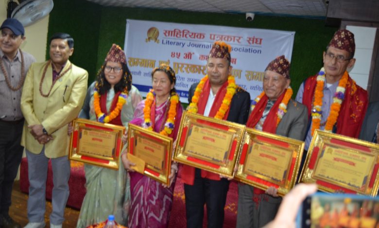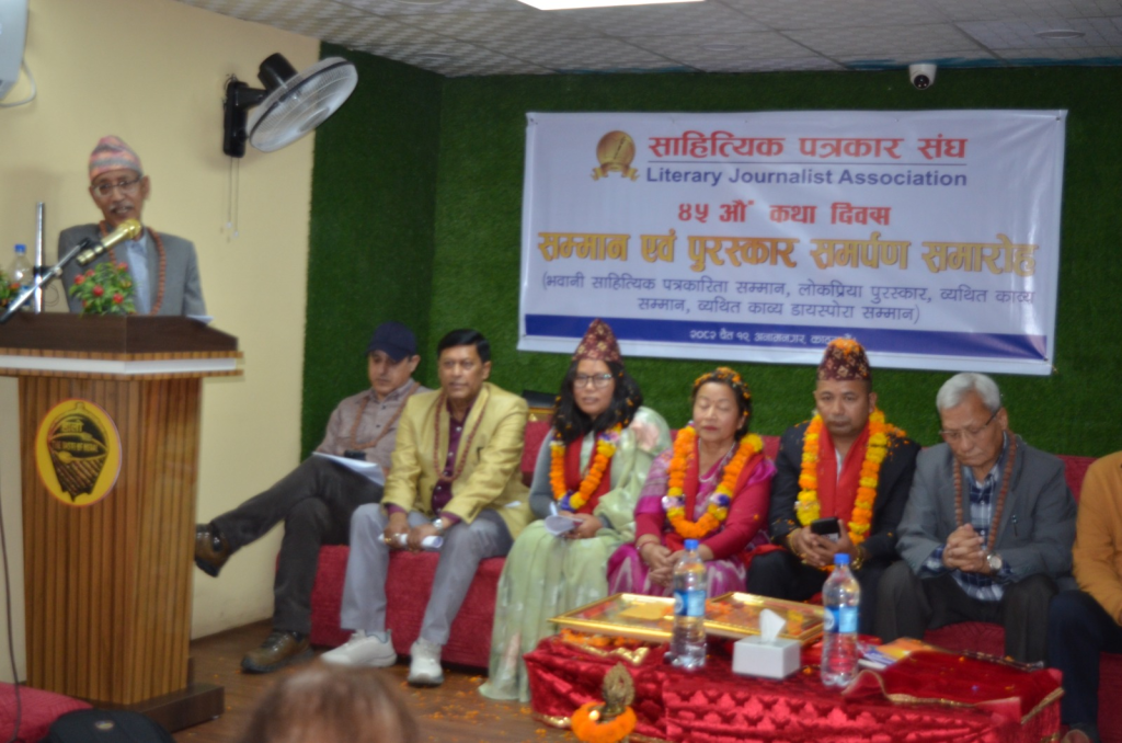काठमाडाैं – साहित्यिक पत्रकार सङ्घद्वारा ४५ औं कथा दिवस २०८२ को अवसरमा काठमाडौंमा स्वदेश तथा विदेशमा रहेका सर्जकहरूलाई सम्मान तथा पुरस्कार समर्पण समारोहकाे आयोजना गरिए ।