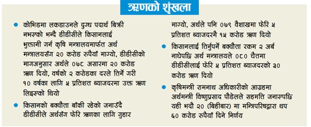 कृषि तथा पशुपन्छी विकासमन्त्री रामनाथ अधिकारीले उपप्रधान तथा अर्थमन्त्री विष्णुप्रसाद पौडेलसँग ऋणको लागि पहल गर्दै आएका थिए । मन्त्री अधिकारीको पहलमा अर्थमन्त्री पौडेलले सर्तसहित ६० करोड ऋण सहमति दिएको कृषि मन्त्रालयले जनाएको छ । कृषिमन्त्री अधिकारीले किसानलाई दसैंअगावै भुक्तानी गर्ने बताउँदै आएका छन् ।