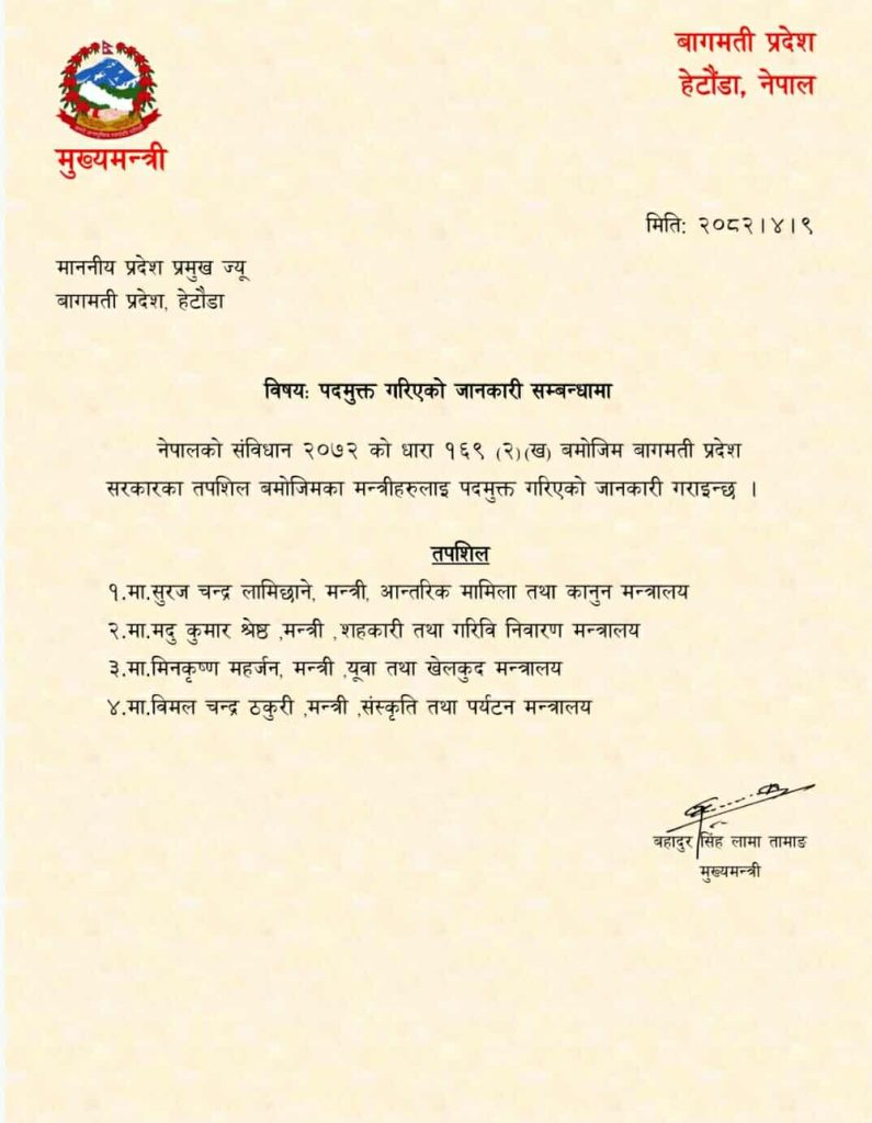 मकवानपुर हेटौंडा । बागमती प्रदेशका मुख्यमन्त्री बहादुरसिंह लामाले नेपालको संविधान २०७२ को धारा १६९ (२) (ख) अनुसार चार मन्त्रीलाई पदमुक्त गरेका छन् ।